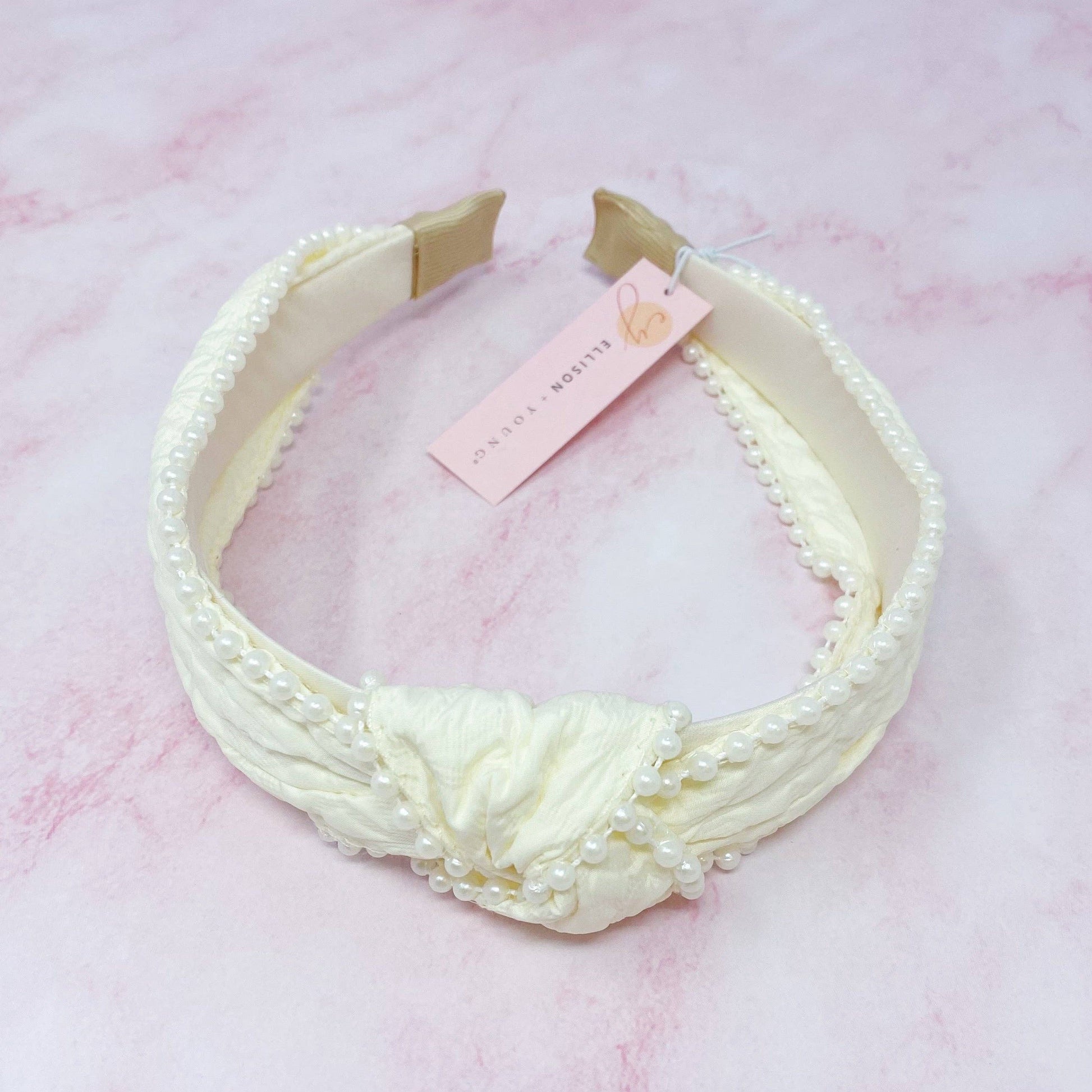This Elegant Knot Pearl Embellished Headband adds a classic and stylish touch to any look. Crafted from an embossed fabric, it features a full complement of pearl embellishments.